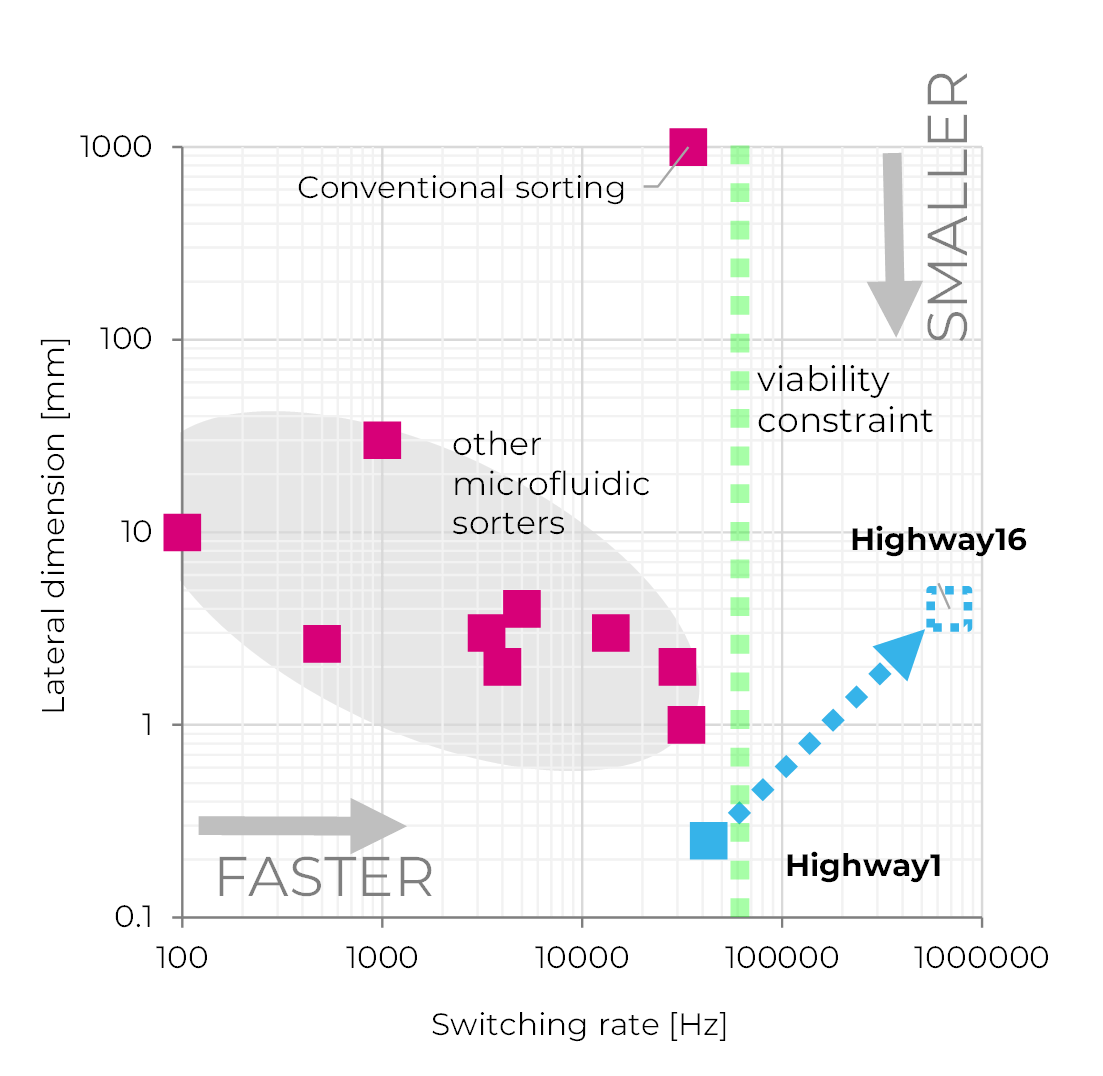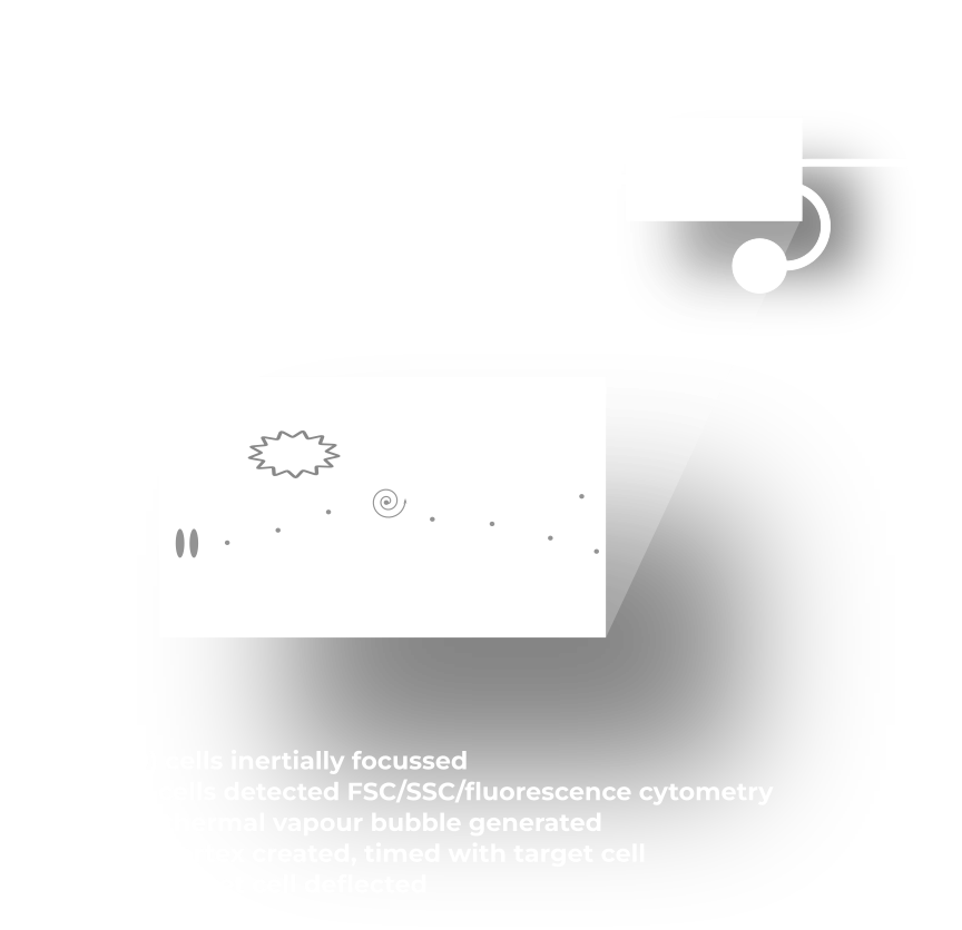 Technology Technology Cellular Highways’ products are based on VACSTM (Vortex Actuated Cell Sorting), a new technology for deflecting cells in a flow cytometer, enabling fast, gentle, scalable microfluidic cell sorting. Cellular Highways’ technology is protected by several patent families in all the major territories. For the invention of VACSTM, we were awarded the 2020 Lee Lucas Award by the Institute of Physics. Cell sorting with an inertial vortex The vortex that deflects the cells can be visualised in computational fluid dynamics (CFD). A thermal inkjet-type microresistor is used to generate a thermal vapour bubble that causes a transient vortex that deflects cells present in a small packet of the flow path. Peer reviewed publications The VACS technology has been used to demonstrate both the smallest high-speed cell sorter in the world and the fastest cell sorter in the world. See our two peer-reviewed papers: Pritchard et al. Lab on a Chip (2019)10.1039/c9lc00120d Zhukov, et al. Micromachines (2021) 10.3390/mi12040389 Machine vision automation We use innovative machine vision techniques to automate the sort process for a truly walk-away sorting instrument. The system automatically captures images of a sample of sort events, and measures the trajectories of cells within the microfluidic channel. This allows the continuous adjustment of actuation timing and amplitude, and live checks of the quality and output of the sort process. Our chips have a unique mechanism to clear out debris instead of letting it clog the microchannel. Software Easy analysis, eay sample handling, and fully automated control of the instrument with our HighwayR software. Exports FCS 3.1 cytometry data files. The Cellular Highways Technology at CYTO 2019 Our co-founder Samson Rogers gave a seminal talk about our core technology at CYTO 2019, when Cellular Highways was spun out.